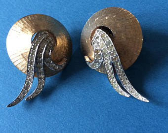 Jomaz clip earrings with goldtone base and rhinestone tendrils. Very typical of the 1950s and a dramatic design statement.The size of the earrings is 4 cm (1 1/2") x 3 cm (1 1/4"). The earrings are in good vintage condition with very minor wear and only a couple of darkened rhinestones which is commensurate with age of the set. The earrings are signed Jomaz on the reverse of the earrings on the clip fittings.This is also advertised on Precious Paste Vintage on Etsy.
