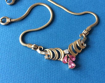 Mazer Bros choker necklace in gold tone metal with rhinestone accents and pink central teardrop paste stones c1940. The length of the necklace is 38 cm (15 1/4") end to end and 36 cm (14 1/2") when the clasp is closed. The drop is 17.5 cm (6 3/4"). The necklace is in very good vintage condition with all stones intact. There is minor wear to the gold tone on the back commensurate with age. There is a Mazer Bros back stamp on the main pendant section.This is also advertised on Precious Paste Vintage on Etsy.