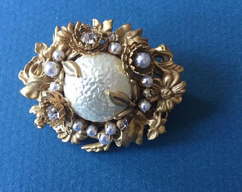 Stunning Miriam Haskell brooch will faux pearls and rhinestones c1950.The brooch measures 5cm x 4cm (2" x 1 3/4"). It is in very good vintage condition with all stones intact. The gold tone filigree metal surround has very little wear. The brooch has a rollover clasp.The brooch is marked Miriam Haskell on the back.